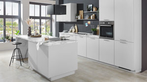 matte seidengraue Fronten, kombiniert mit seidengrauen Korpussen und edelstahlfarbenen Metallgriffen