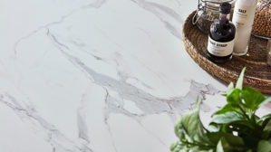 Arbeitsplatten und Ansetztisch in weißer Venato Bianco Marmor-Nachbildung